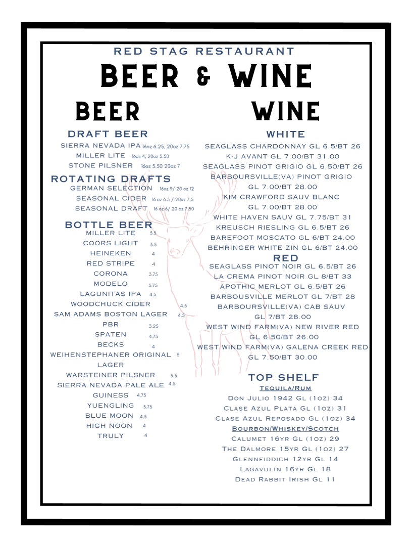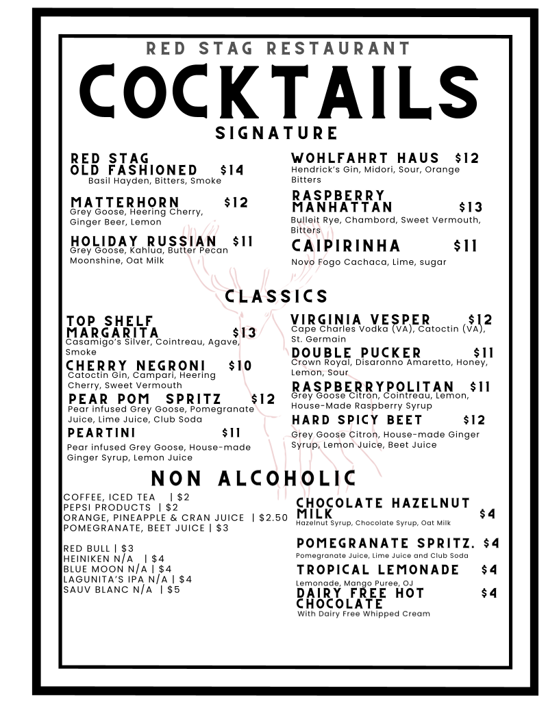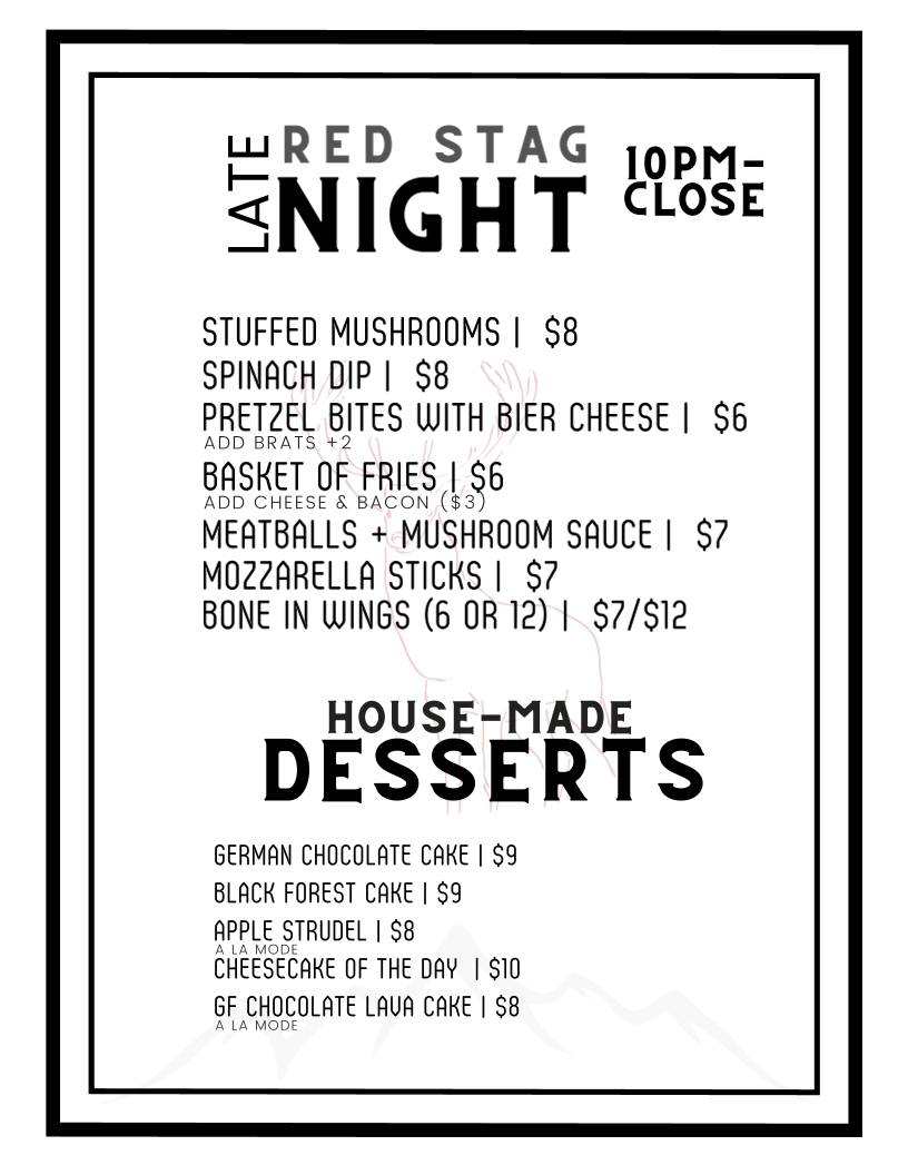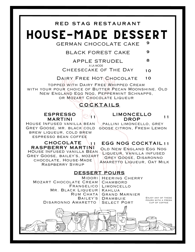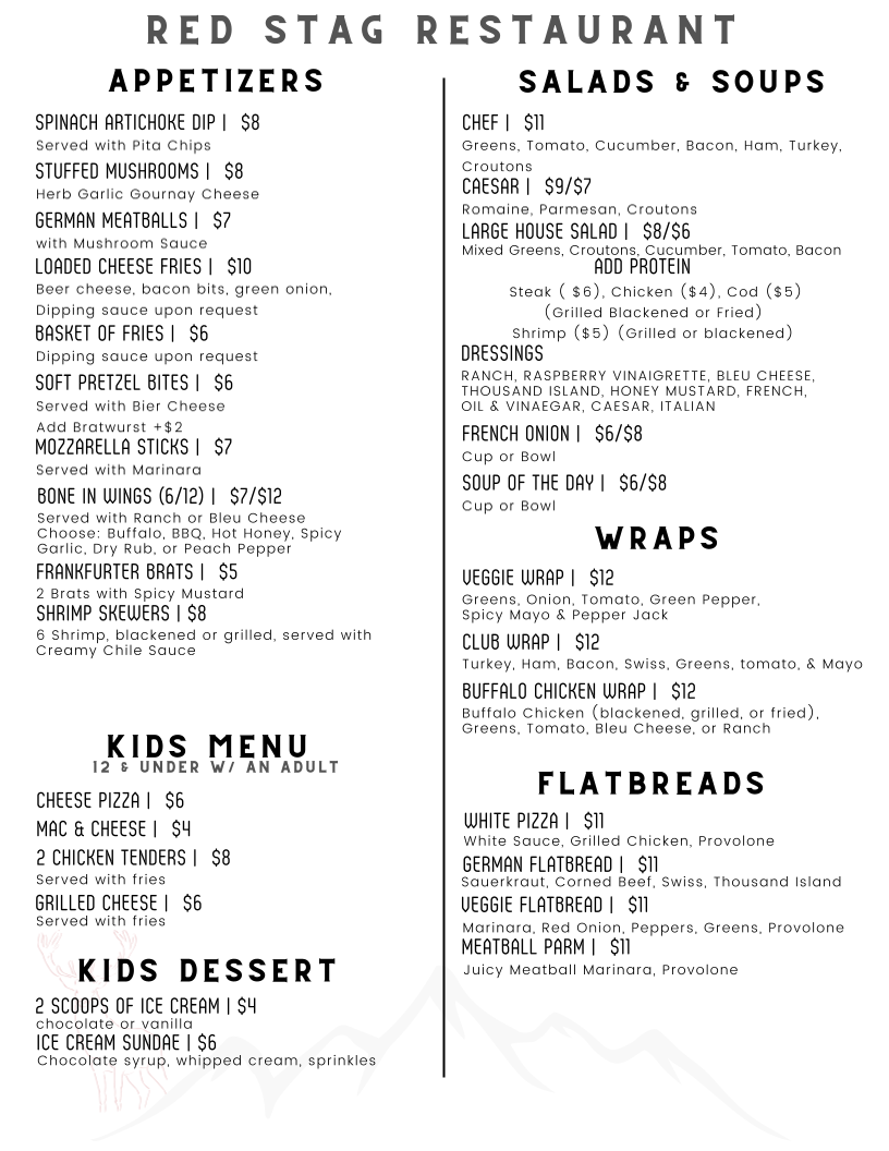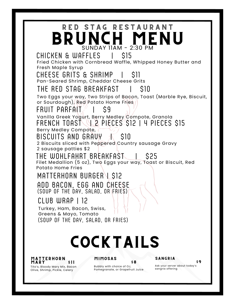 Whether you’re in the mood for a casual bite or a more filling meal, The Red Stag Restaurant & Matterhorn Lounge provides a satisfying dining experience with a menu that has something for everyone.