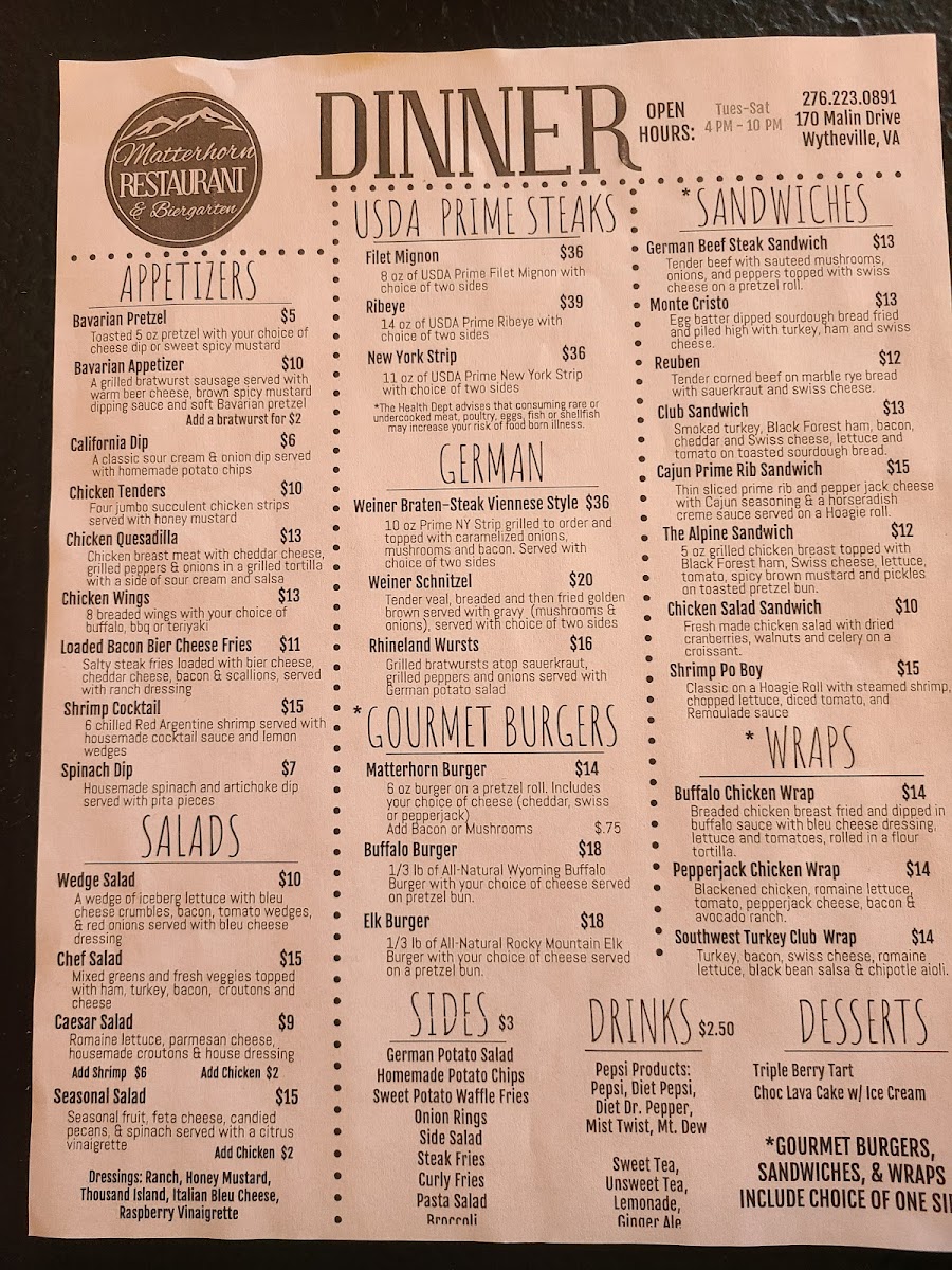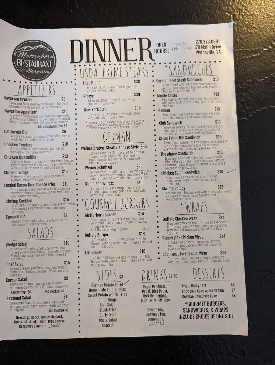 Additionally, there’s a variety of sides available, from French Fries to Side Mac N Cheese, as well as flatbreads like the German Flatbread and Meatball Parm. The restaurant also offers an extensive drink selection, including wines, beers, and cocktails such as the Red Stag and Matterhorn, perfect for any occasion.
